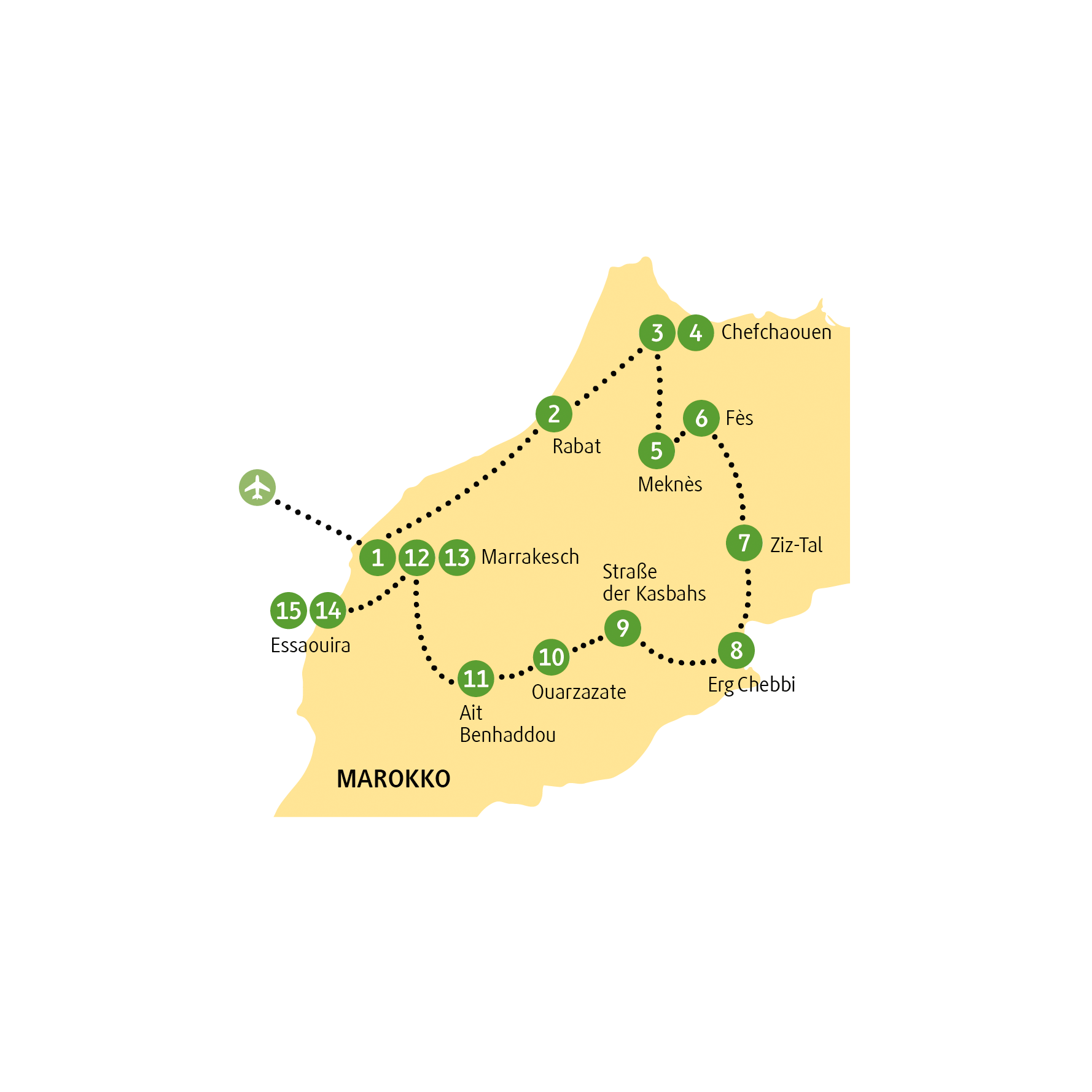 • 14 Übernachtungen in Hotels und Gästehäusern (Riads) sowie in einem komfortablen Zeltcamp in der Sahara