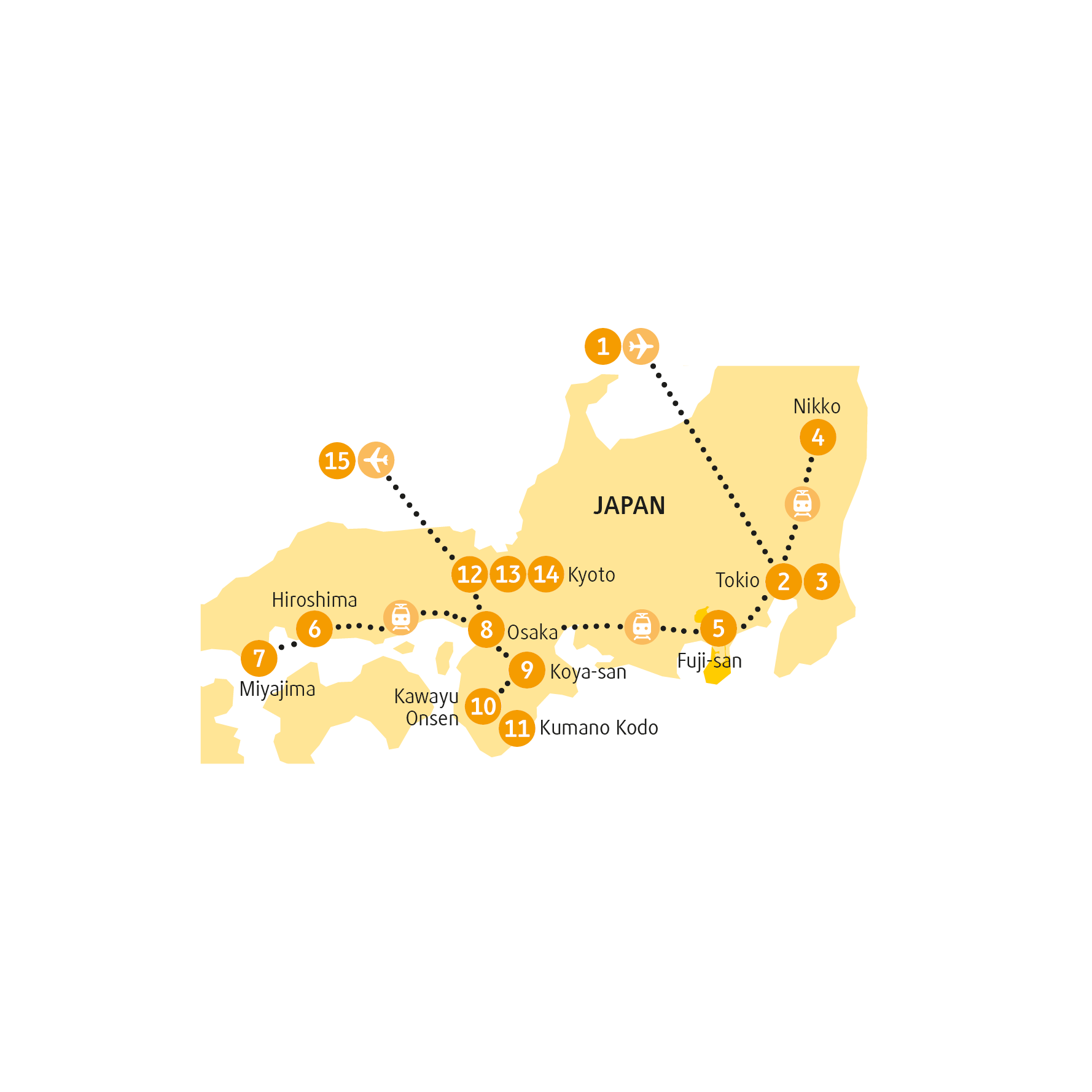 1.074 Jahre lang war Kyoto der Sitz des kaiserlichen Hofes. Überwältigende Kulturschätze und 1.600 buddhistische Tempel sind Zeugen dieser ehrwürdigen Zeit. Auch das Meisterwerk aller Tempel, Kiyomizu-dera. Allen, die von seiner Terrasse springen, wird ein Wunsch erfüllt. Lass es, komm lieber mit in die »Sonnenscheinstadt« Nikko, den Fuji-Hakone-Izu-Nationalpark, Hiroshima, Osaka und über die Weltkulturerbe-Route zum Kumano Hongu Taishavon, dem Hauptschrein von über 3.000.