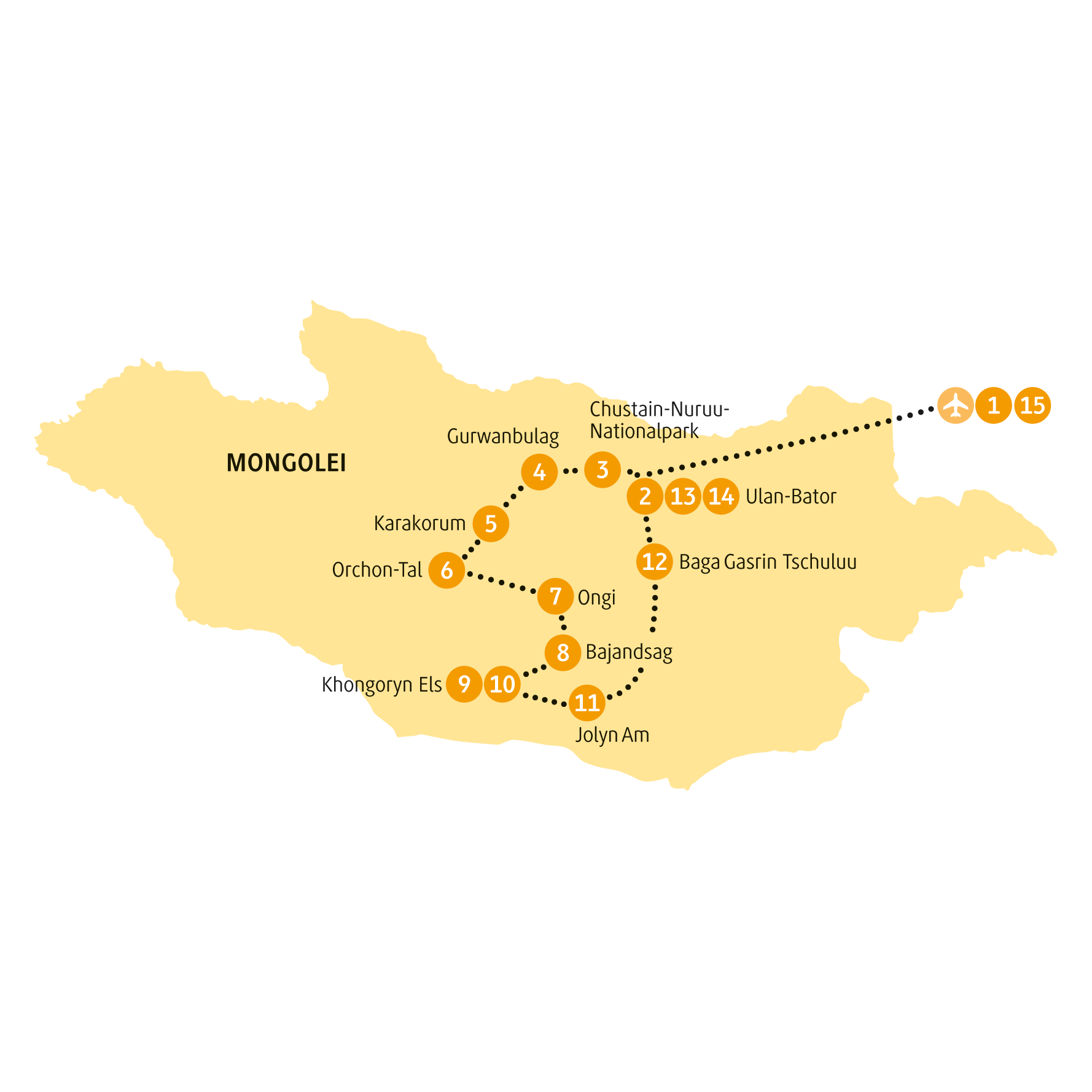 Noch eine Nacht im Jurtencamp. Noch einmal authentisches Mongolei-Feeling, dann heißt es Abschied nehmen von den malerischen Landschaften und ihrer geheimnisvollen Einsamkeit. Am Nachmittag sind wir zurück in Ulaanbaatar AS-MN-ST-Ulaanbaatar14. Hier schließt sich der Kreis deiner Reise durch das Land eines gnadenlosen Herrschers. Der Himmel schickt noch einmal sein schönstes Blau, wenn das Ende naht. Nur fallen wir nicht vom Pferd, sondern heben ab in Richtung Europa 15, wo ein anderer Wind weht.
