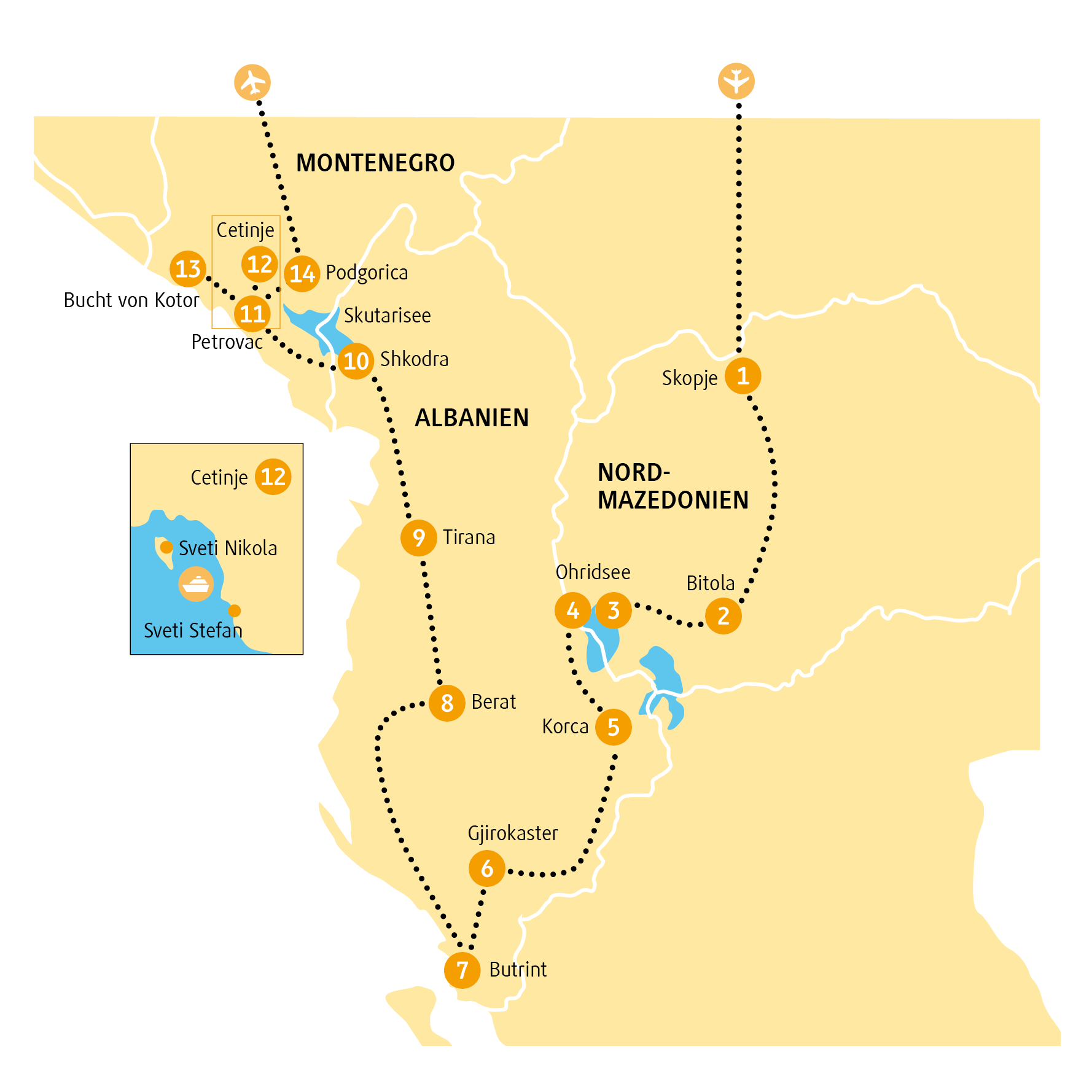Die erste Etappe führt dich heute auf einer der spektakulärsten Straßen Montenegros nach Cetinje. Immer wieder erwarten dich tolle Ausblicke aus der Vogelperspektive auf kleine Buchten mit traumhaften Stränden. Alte Botschaftsgebäude und prachtvolle Renaissancepaläste erzählen später die Geschichte der alten Königshauptstadt. Einst Heimatstadt der Fürstenfamilie Petrovic, ist Cetinje heute offizieller Sitz des montenegrinischen Präsidenten. Über kurvige Bergstraßen entlang des Lovcen-Nationalparks geht es weiter ins Dorf Njegusi, das für seine typisch lokalen Spezialitäten bekannt ist. Hier wird der berühmte Rohschinken produziert, den du mittags in einem urigen Gasthaus verkostest. Außerdem probierst du den traditionellen Traubenschnaps »Rijeka«. Zum Wohl – oder besser »Zivjeli«, wie es hier heißt! Während eines kleinen Verdauungsspazierganges im Lovcen-Nationalpark tankst du frische Luft und neue Kraft für das nächste Highlight. Eine atemberaubende Talfahrt hinab der Serpentinenstraße führt dich wieder an die Küste. Zunächst erkundest du Budva auf einem Spaziergang. Das historische Zentrum zählt zu den schönsten Altstädten des Landes. Anschließend unternimmst du eine Bootsfahrt mit tollem Blick auf die Küste und die Inseln Sveti Nikolaus und Sveti Stefan.